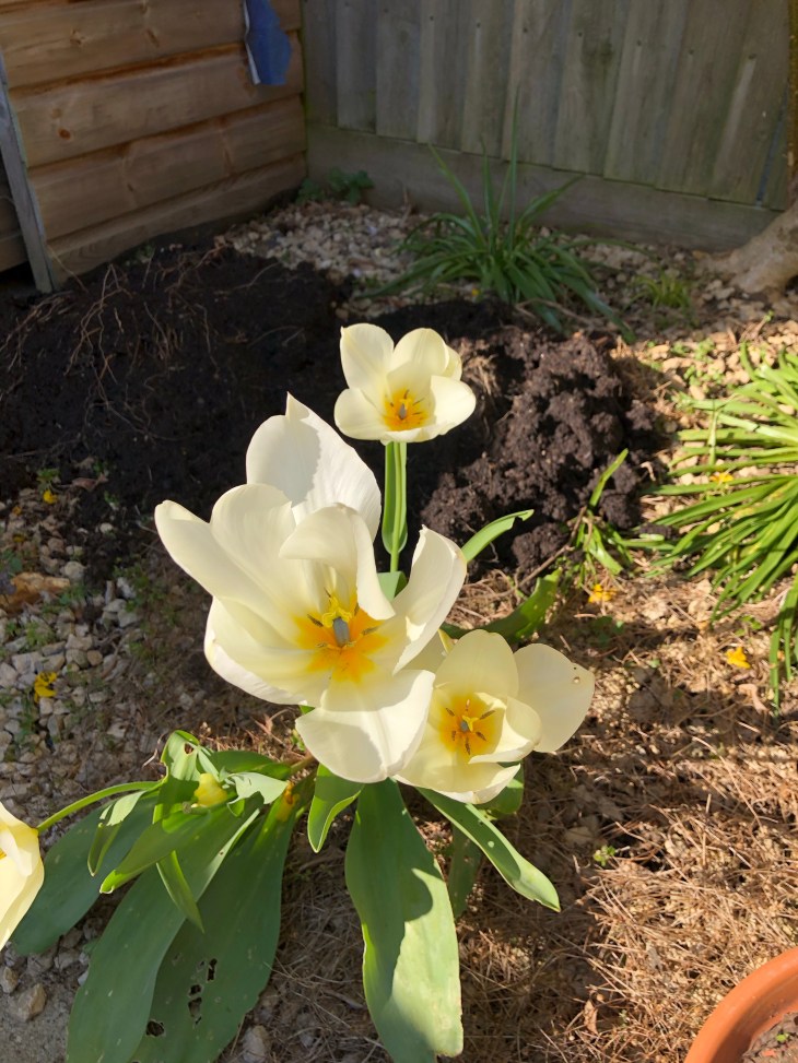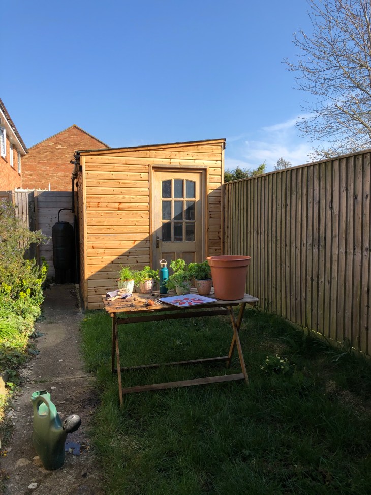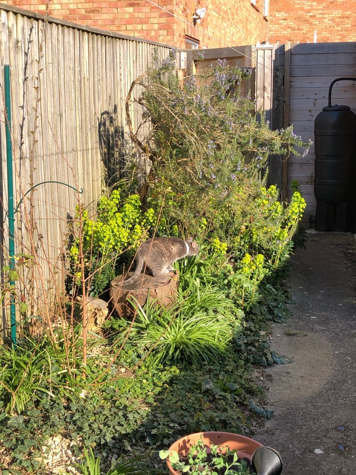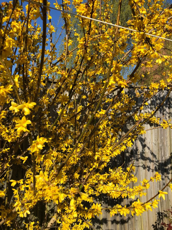 I set up a little planting stand on the lawn between my office and the patio, so the compost scatter could fall through and benefit the grass, which I’m still trying to develop– it’s very patchy. I had been borrowing the neighbour’s mower, but she moved away in December, so I’ve made the investment of actually buying my own lawn mower, and it arrives on Tuesday. (Argos is still operating deliveries, no contact.) That will help it develop as I sew new seed next week. The forsythia is in full bloom, and the one random tulip in the bed is fully open. I started spreading last year’s exhausted compost from the potted veg over the bed– this is my new method of combatting the hated stones.