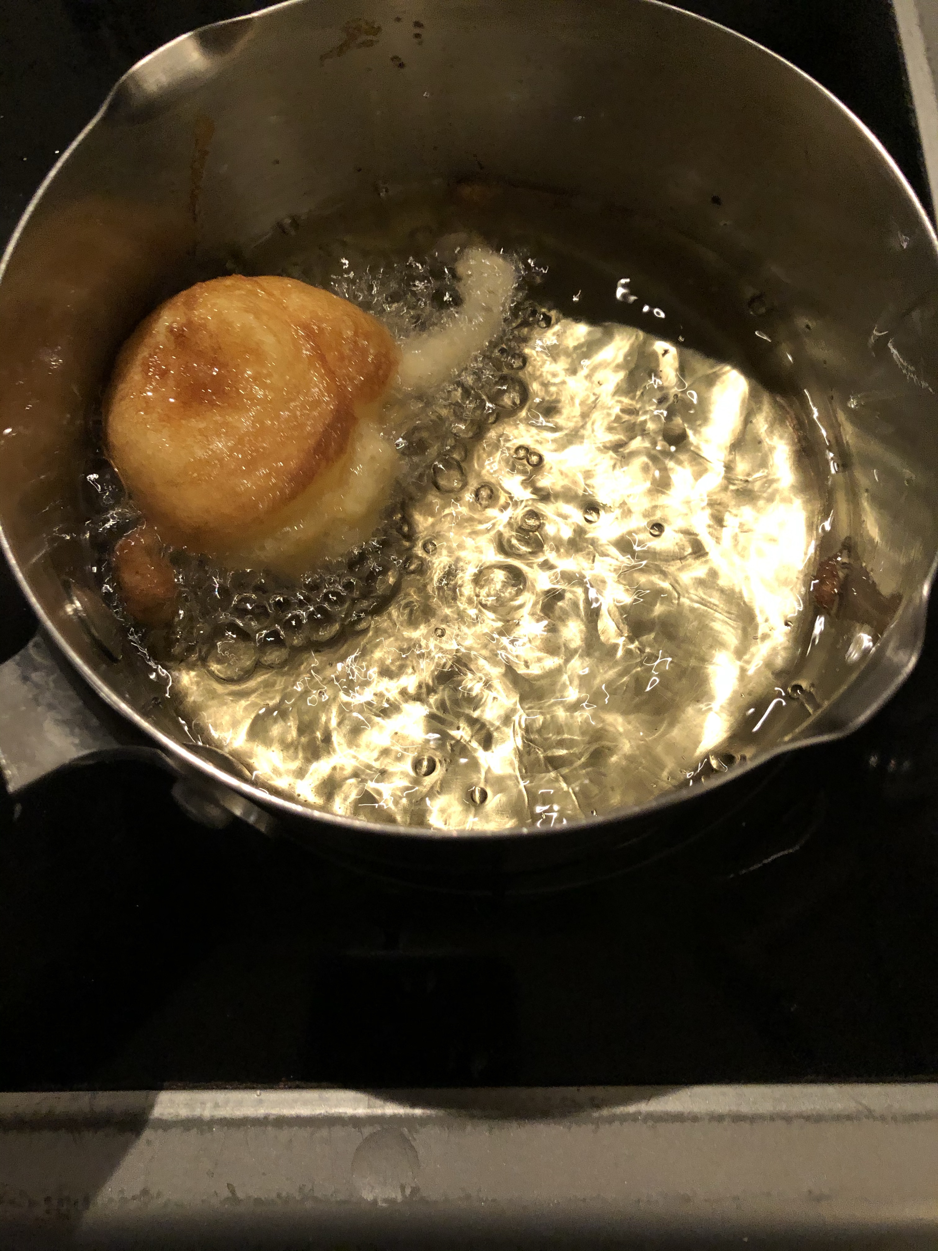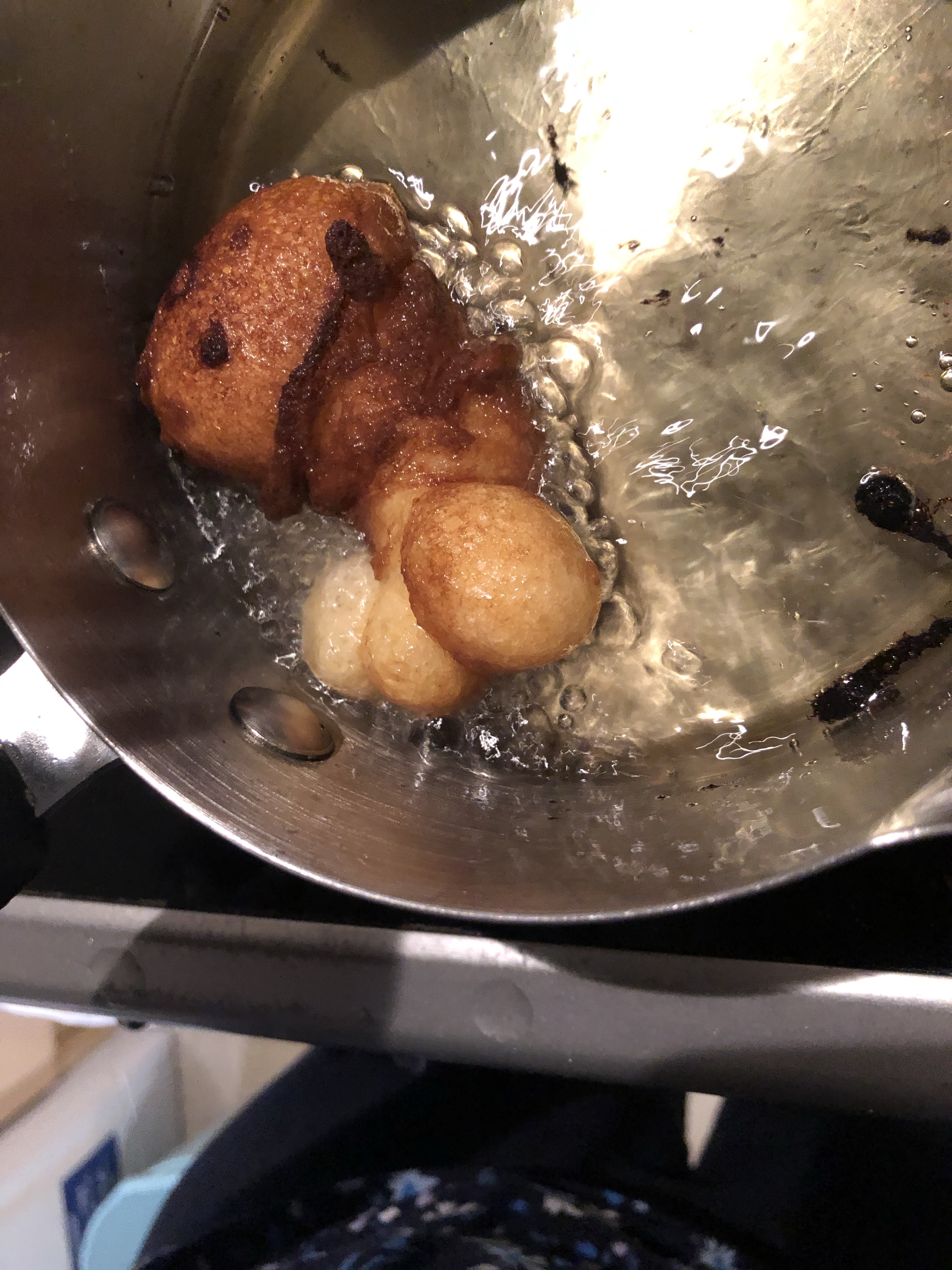 The batter was a bit strange to work with, and the temperature of the oil really changed the end product, but they were yummy and fun. The batter puffed up a lot in the hot oil, because of the level of baking powder, but they turned crispy on the outside and foamy on the inside as they cooled. I strongly recommend eating them with other people, as you don’t want to eat the whole batch yourself, you’ll feel ill, and they won’t be good if they’re not fresh.