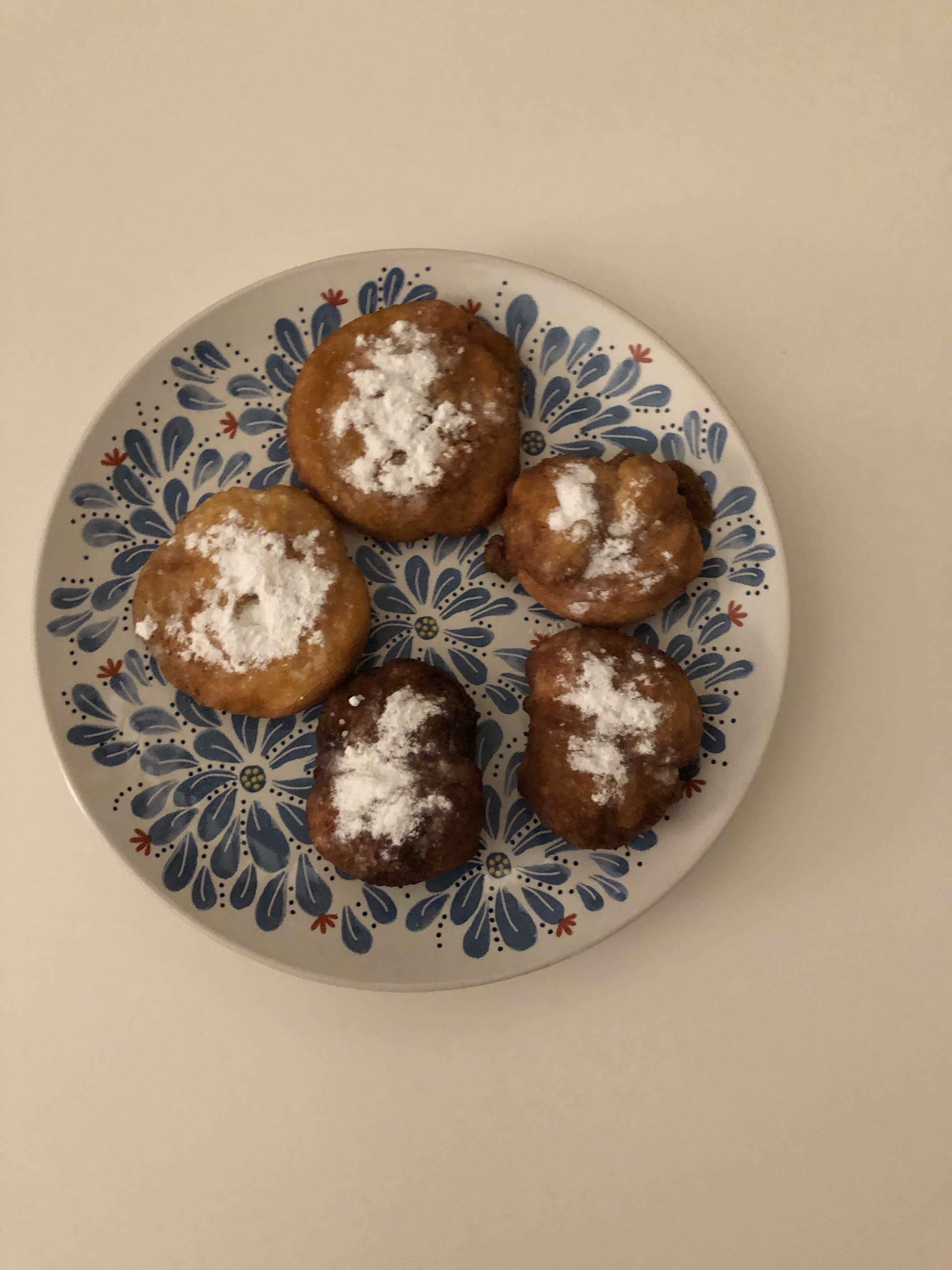 Mix all ingredients well and drop into hot oil by the spoonful. Fry until golden brown and sprinkle with confectioners’ sugar or honey if desired. [I used confectioners’ sugar, but I think honey would be delicious.]