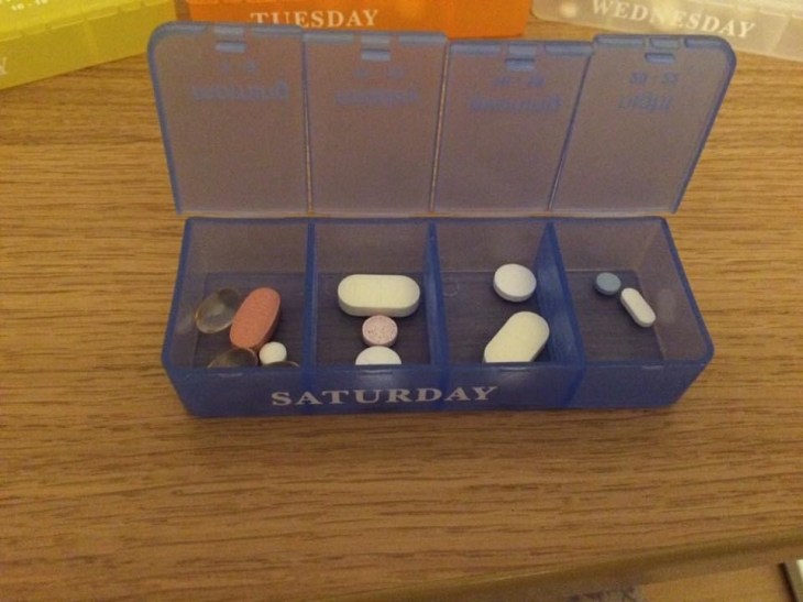 I don’t do my meds on Saturday night anymore, but I still have a lot of pills I take every day! I’ve managed to work with the docs to get it down to three groupings a day, instead of four. Some pills have stayed the same, and others have changed! There are more of some and fewer of others. It’s all a balancing act.